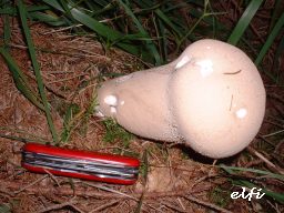 Pilze können einen ungemein erschrecken, besonders wenn sie so groß sind wie der erste den ich sehe. Waren wir denn am Freitag blind gewesen, es sind doch nur zwei Tage vorbei... oder kann so ein tolles Exemplar in so kurzer Zeit wachsen? Schwer zu sagen. Mitnehmen kann ich ihn eh nicht, er fühlt sich recht weich an, also ist er von Pilzfliegenlarven ausgehöhlt.