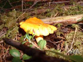 Drei Autos stehen auf dem Parkplatz, das juckt mich überhaupt nicht, denn Totentrompeten sammelt hier keiner! Erst muss ich Bergschuhe anziehen, damit ich in dem steilen Gelände gut zurecht komme, dann geht's hinauf. Von Weitem sehe ich gelbe Pilze im Gras, pfifferlingsgelb ist das nicht! Erst als ich ganz nah bin, kann ich die Pilze bestimmen.