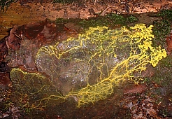 Glöckchennabelinge die auf alten Baumstümpfen gedeihen und feinste Schwindlinge die auf Fichtenzapfen wachsen werden so "mitgenommen". Harry entdeckt ein kleines Zweiglein, das mit gelben Tropfen übersät ist: "Ein bildhübscher Schleimpilz!" Leocarpus fragilis das Löwenfrüchtchen Auch er verschwindet in Karls Pilzbox.