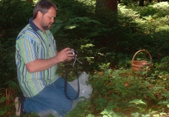 Das Wetter ist schön und wir entscheiden uns für den nächstbesten Wald den wir durchfahren. Es ist ein Wald mit Weißtannen, Fichten, Buchen, Ahorn und der Boden ist bedeckt mit Moos, Farn und Unmengen von Brombeeren, die sich zu gerne um die Füße wickeln. Vorsicht ist angesagt, um nicht in ihnen zu verhängen. Die ersten Pilze die Karl aufnimmt sind kleine Helmlinge, weissmilchende und rotmilchende, es gibt auch Helmlinge die geben keine Milch her!
