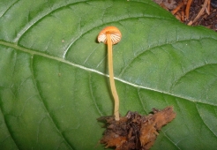 Zu unserer Fundliste gesellt sich ein Röhrling: ein Rotfüchen. Ganz begeistert ist Karl von einem Orangeroten Helmling, dieser Winzling steht alleine am Wegesrand und wir stellen alles Mögliche an um ihn ins rechte Licht zu rücken.
