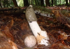 Gut, dass dieser Pilz so frisch ist, dass er eben erst beginnt seinen penetranten Geruch zu entfalten, die Fliegen bekommen ihn eben erst mit. Aber um uns herum stehen viele Exemplare dieser Art und lassen uns zwar mit der nötigen Sorgfalt aber ohne Verzögerung den Pilz ablichten.